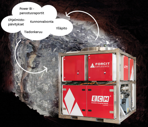 ForSmart -ohjausjärjestelmän mukana tulevat vakiona järjestelmään kuuluvat pilvipalvelut ja optiona tarjolla olevat pilvipalvelujen laajennukset. Pilvipalvelua käytetään mm. yksikkökohtaisten käyttäjäoikeuksien ylläpitoon, panostusraporttien jakamiseen, ohjelmistopäivityksiin, huoltotoimiin sekä big datan keräämiseen ja analysointiin. Big datan keruussa hyödynnetään teollisten laitteiden kommunikointiin kehitettyä OPC UA standardia ja olemassa olevaa ForDEX ohjelmistokokonaisuutta. Panostusraportit voidaan jakaa pilvipalvelun kautta asiakkaille valmiina Power BI –raporttina (kuva 3). Ohjelmistopäivitykset tapahtuvat ForSmartin DevOps -ympäristössä osittain automatisoidusti, mutta kuitenkin operaattorin manuaalisesti hyväksymänä. Etäyhteyksiä voidaan hyödyntää ennakoivan huollon tarpeen määrityksessä sekä vikadiagnostiikassa.