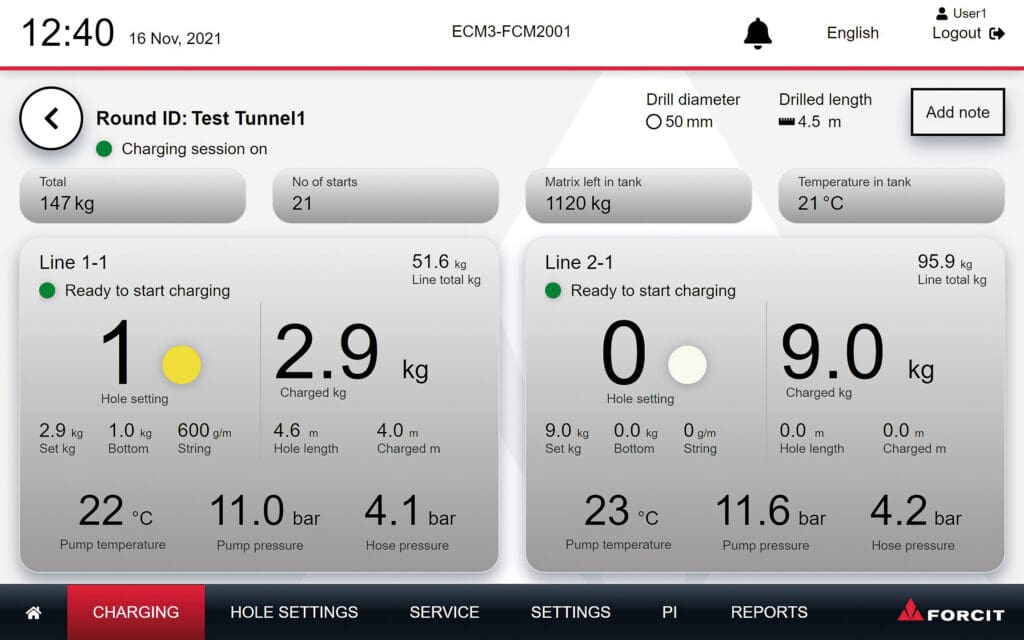 Uusi ohjausjärjestelmä sisältää kolme erilaista yksinkertaista käyttöliittymää tunnelilouhinnan panostusreseptien ja reikäasetusten määrittelyyn ja valintaan Mode 1 -käyttöliittymä on täysin uudenlainen ja kehitetty erityisesti norjalaisten käyttäjien toiveisiin ja käyttötapaan perustuen. Se sopii erityisesti pitkien samalla tunneliprofiililla täysperälouhintana tehtävien tunnelien panostukseen. Mode 2 -käyttöliittymä perustuu Ruotsissa tutuksi tulleeseen ECM2-yksikön käyttötapaan, jossa panostusresepti valitaan erillisellä manuaalisella kytkimellä. Mode 3 -käyttöliittymä muistuttaa suomalaisten käyttäjien omaksumaa ECM1 -laitteen käyttöliittymää, jossa kaikki toiminnot panostusreseptin valinta mukaan lukien tehdään kaukosäätimen avulla. Varsinainen panostusnäyttö on kaikilla kolmella käyttöliittymällä samanlainen (kuva 2). Ohjausjärjestelmän kieliversiot ovat suomi, ruotsi, norja ja englanti. Muut kielet voidaan ottaa käyttöön tarvittaessa.